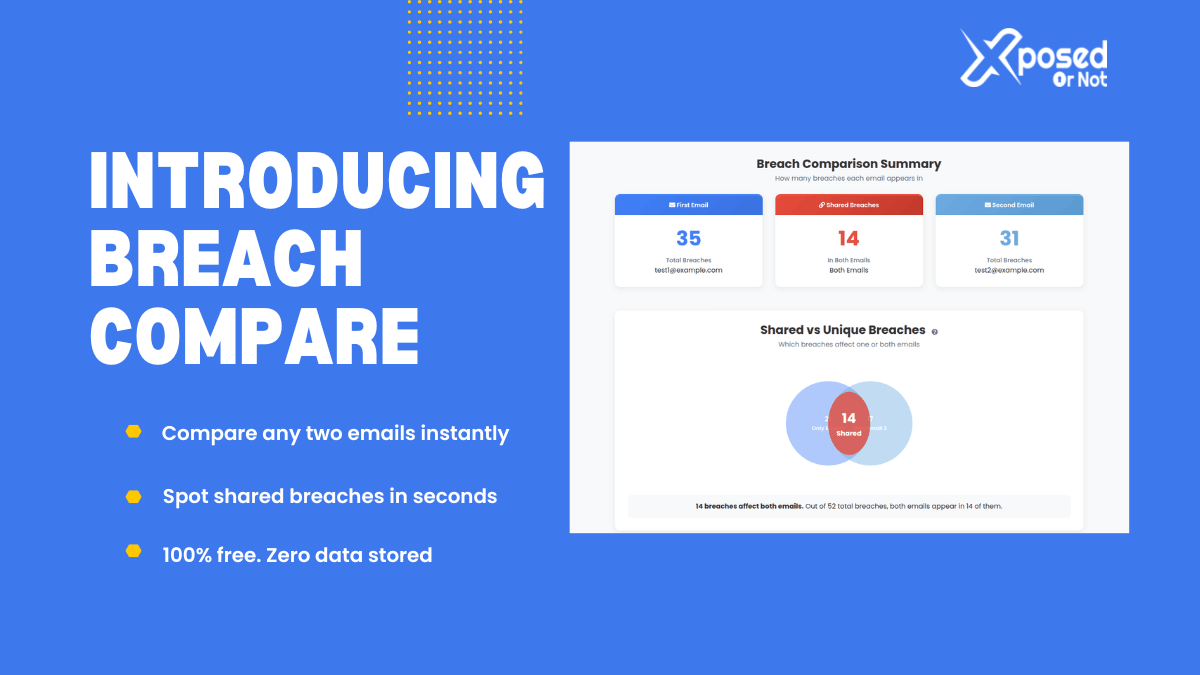 Compare two email addresses for data breaches. See shared leaks, risk scores, and exposed data, all in one free search without signup required.